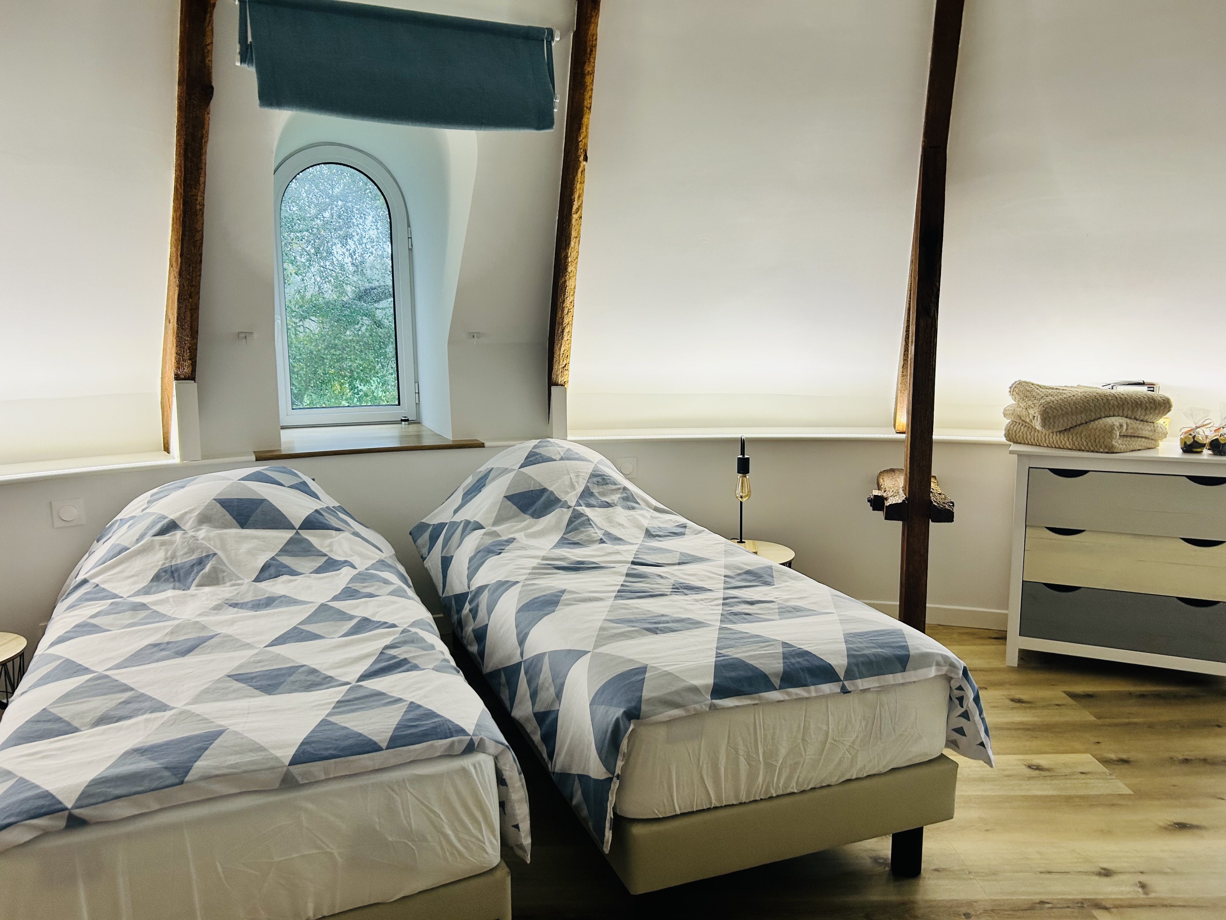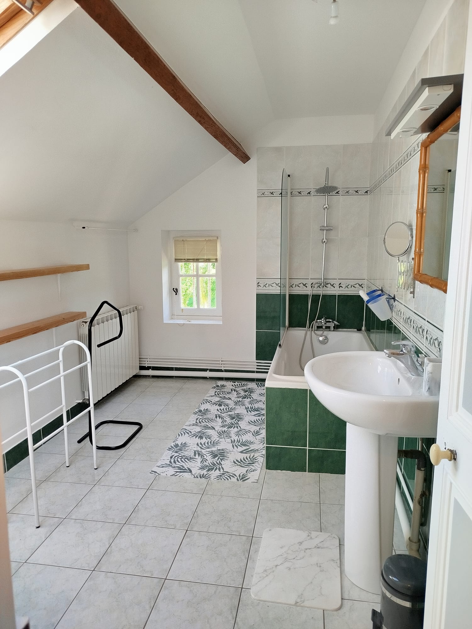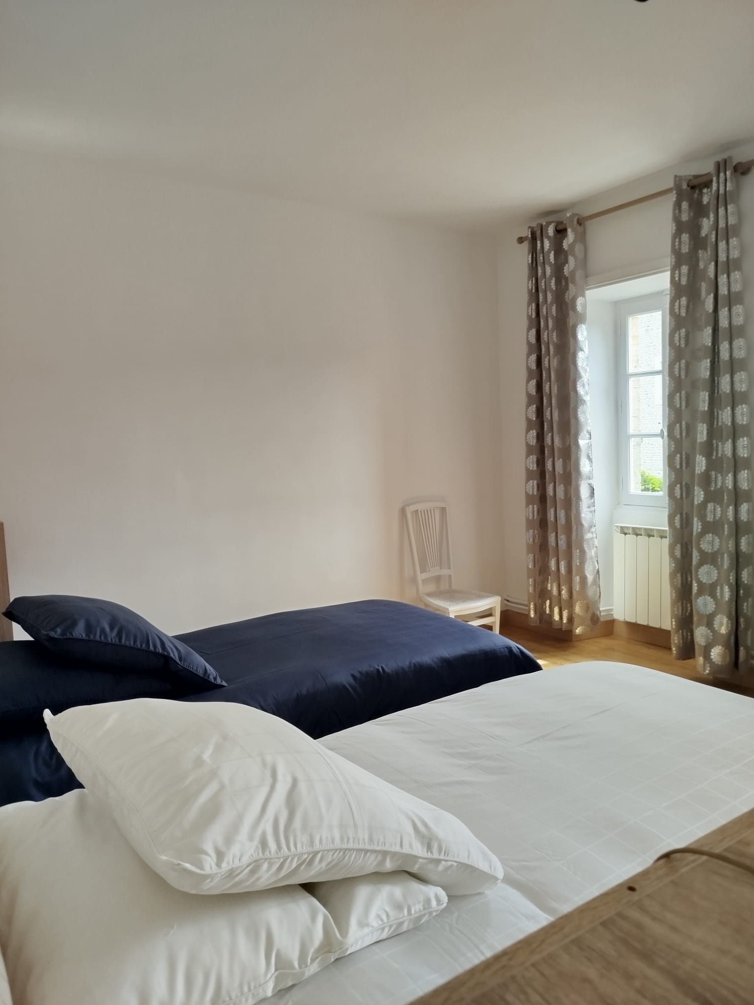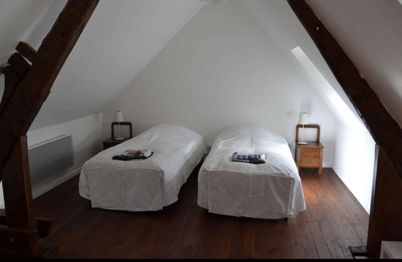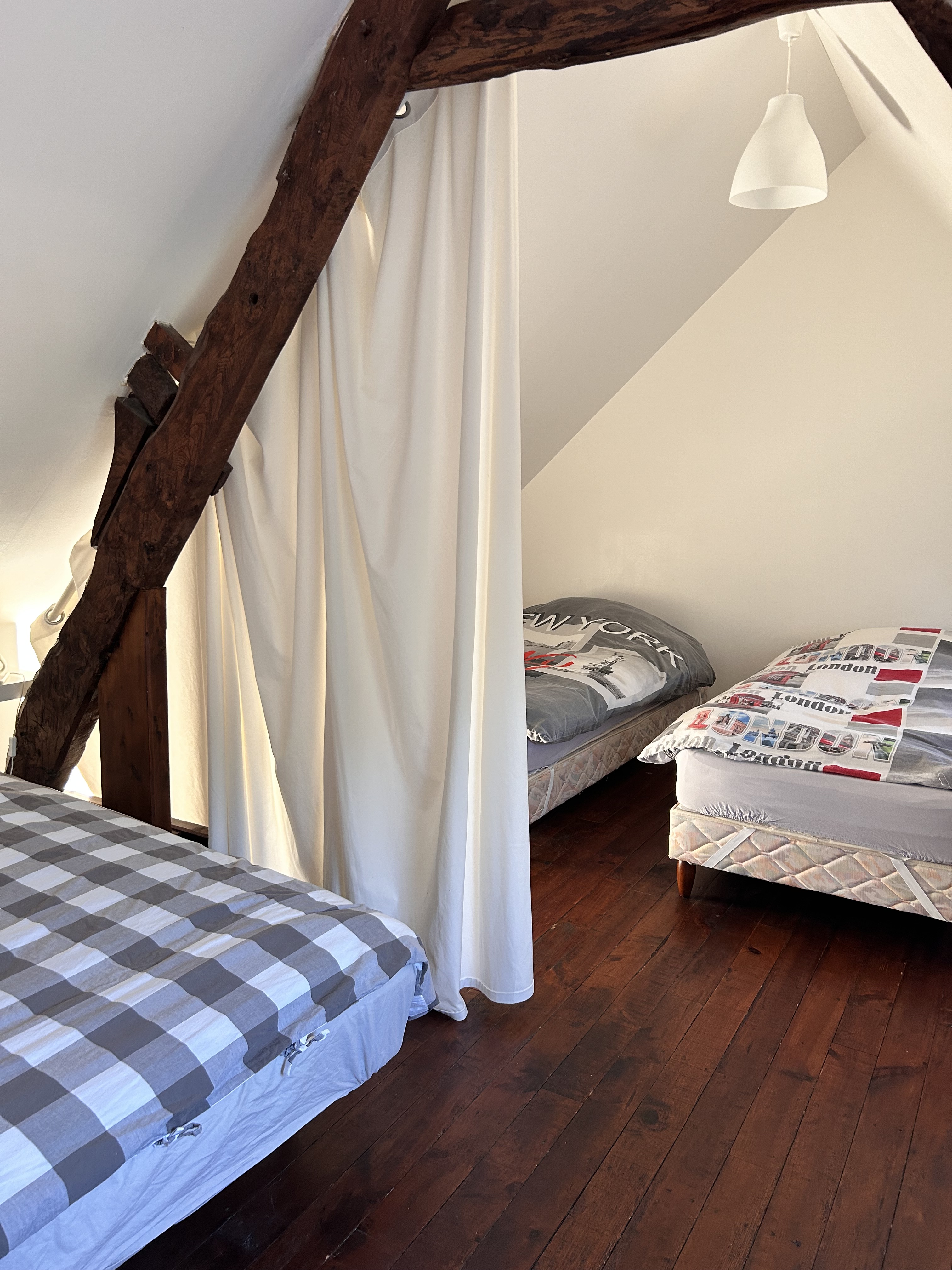 Grande maison de deux chambres avec salle de bain privative chacune au premier étage. Au second étage, chambre mansardée avec deux lits simples.
