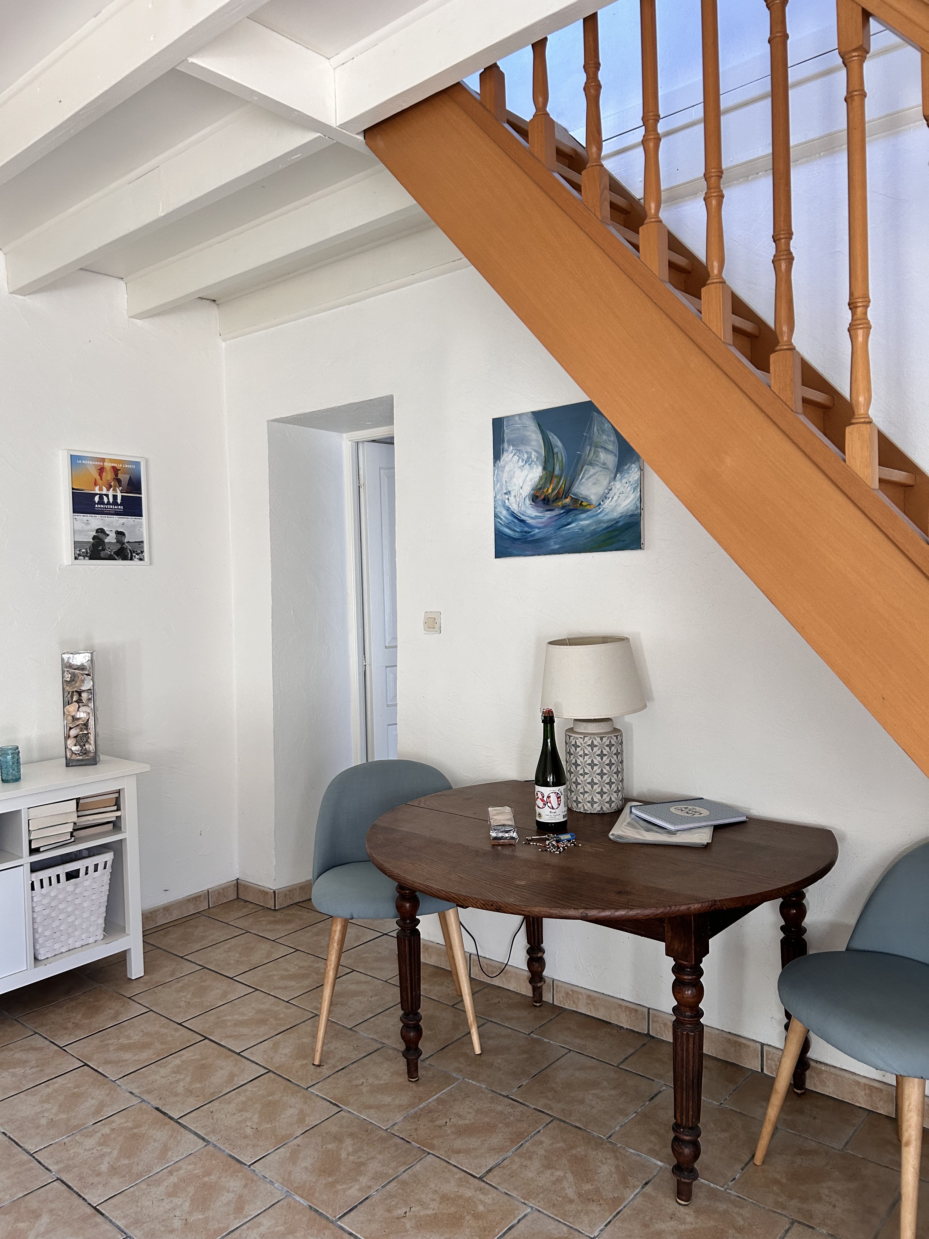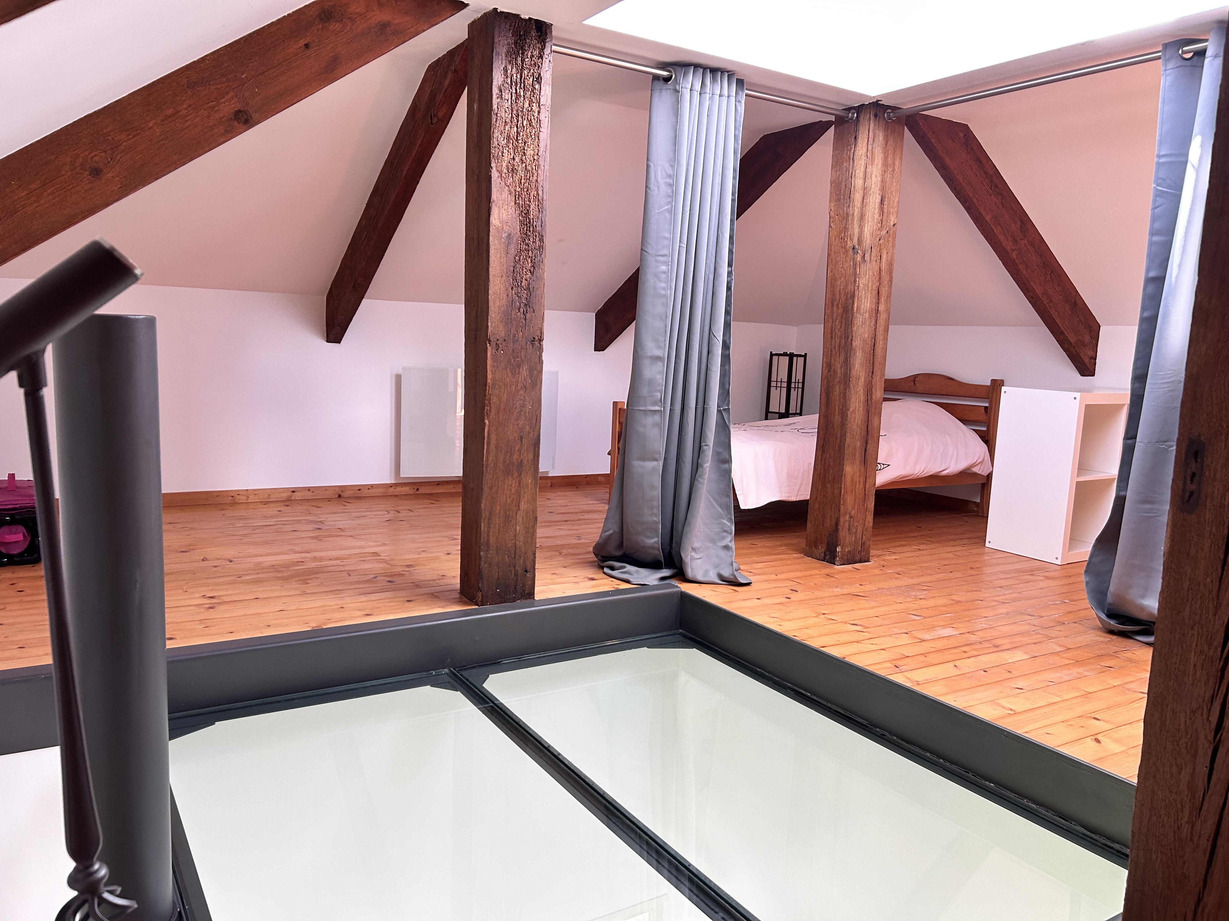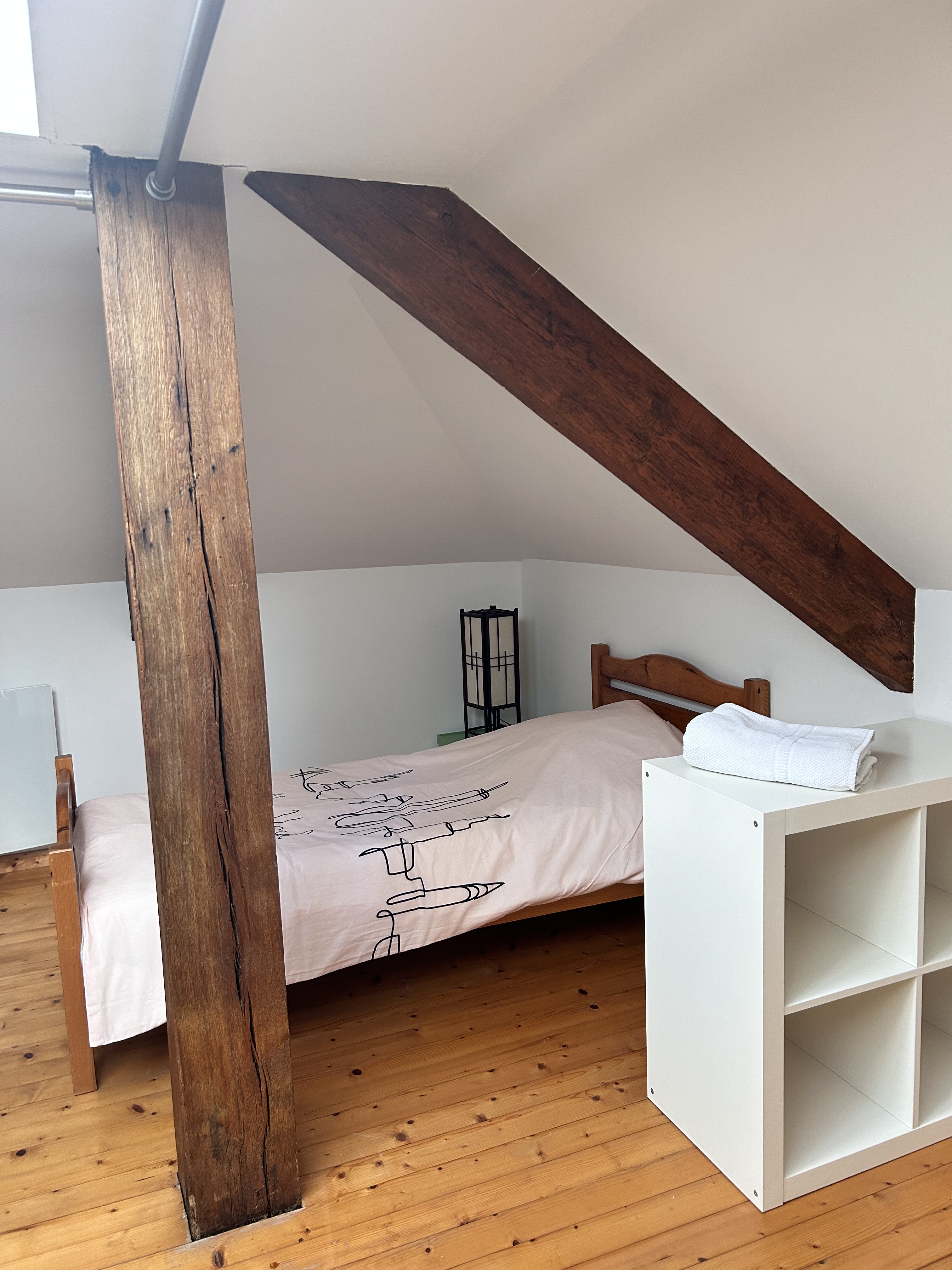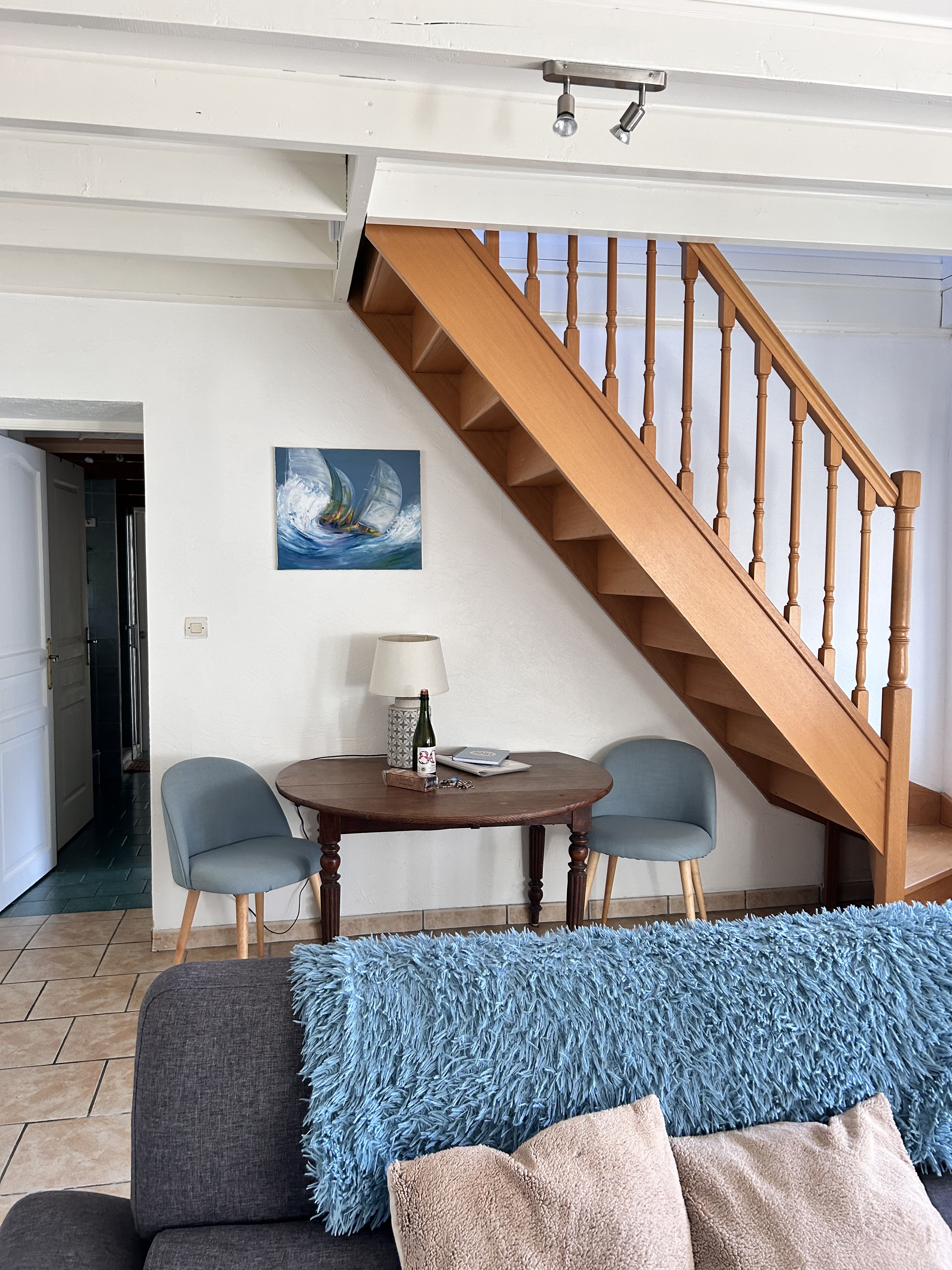 Grande maison de deux chambres avec salle de bain privative chacune au premier étage. Au second étage, chambre mansardée avec deux lits simples.