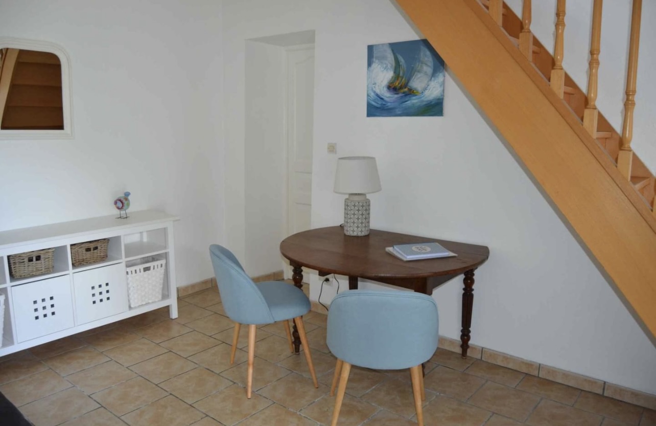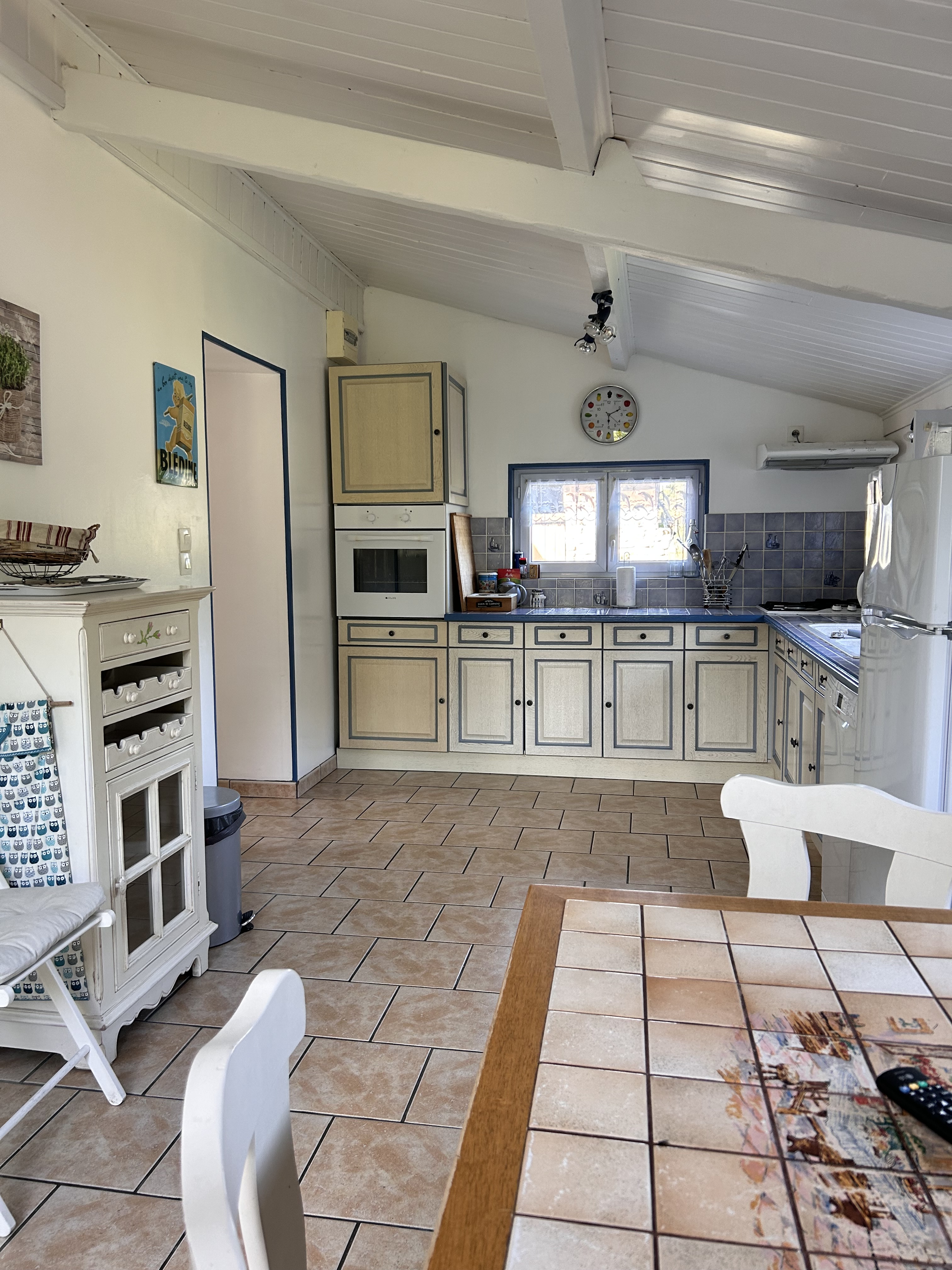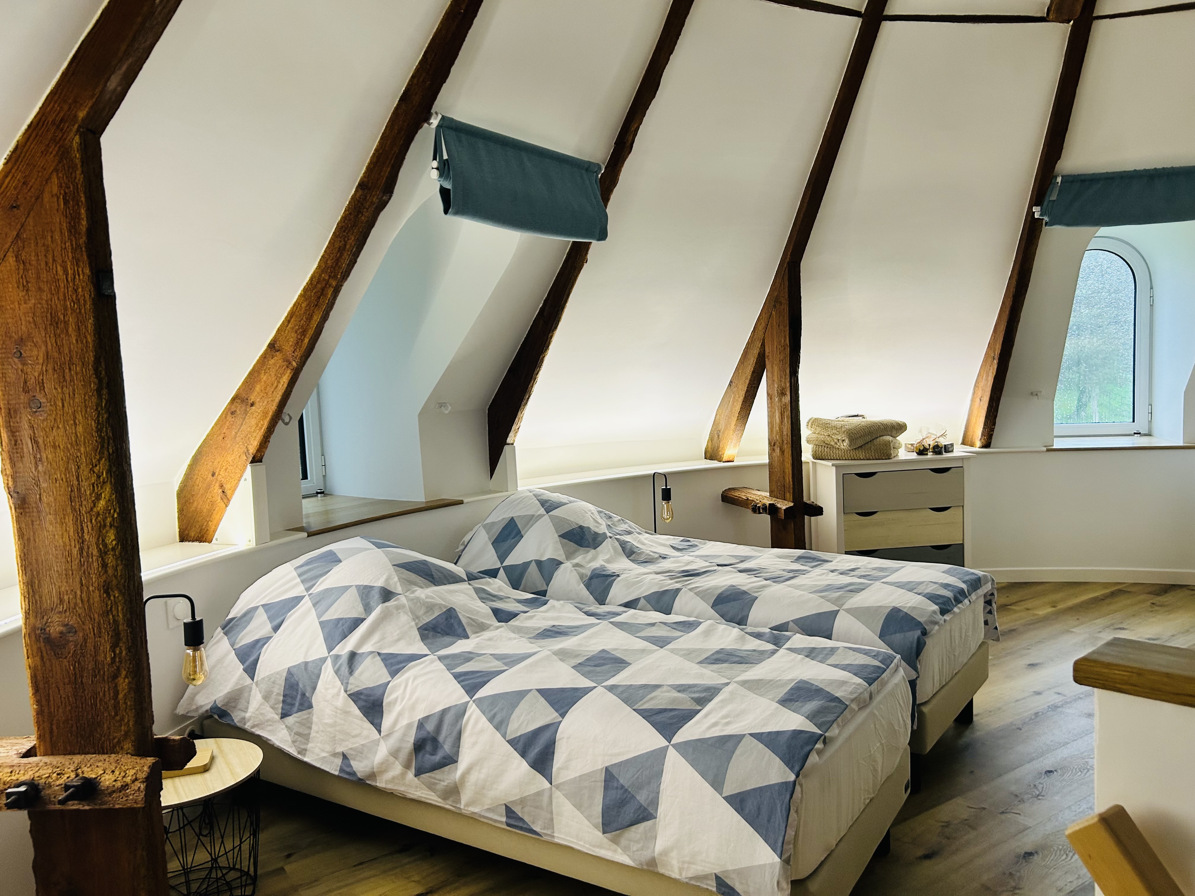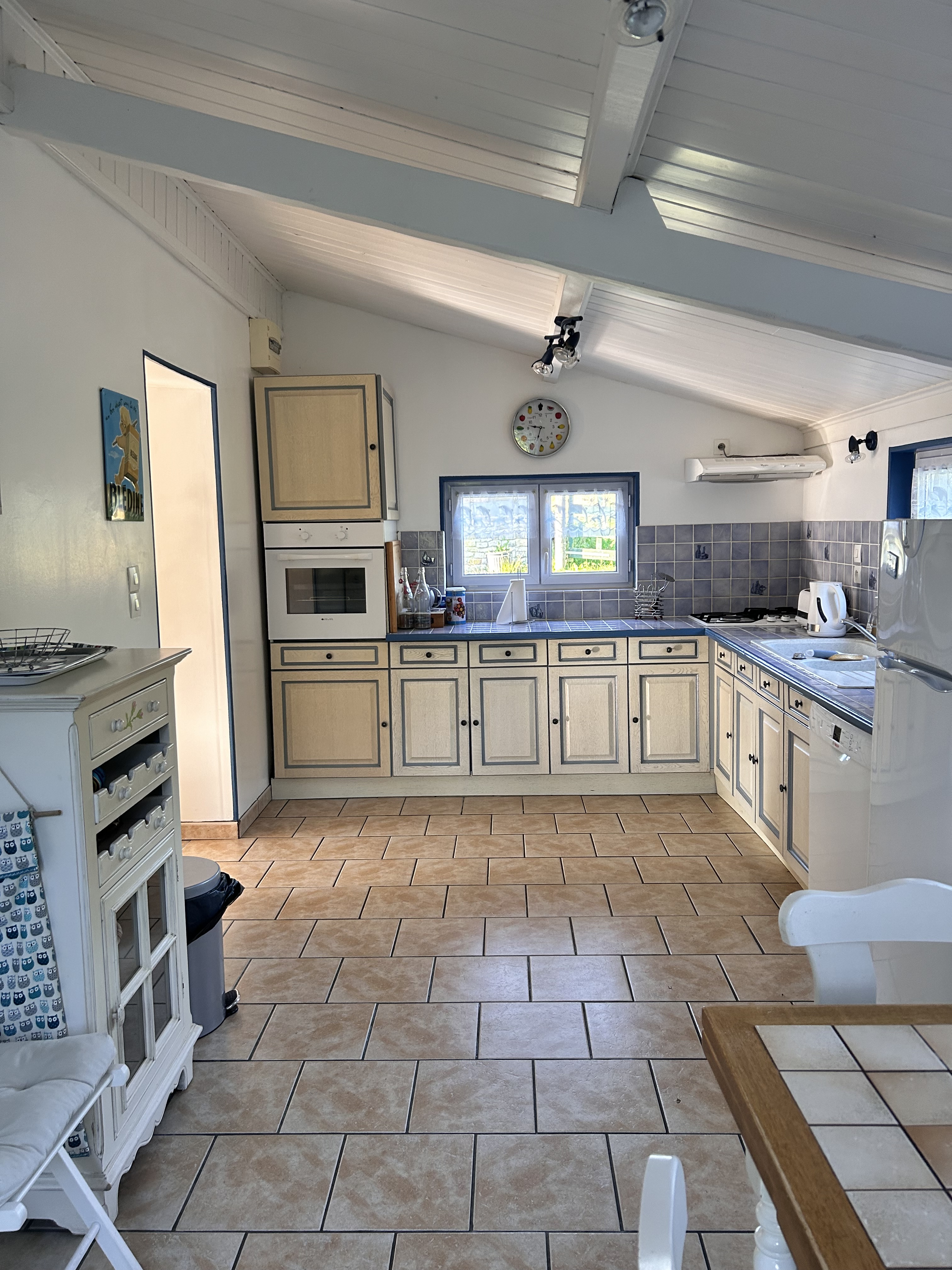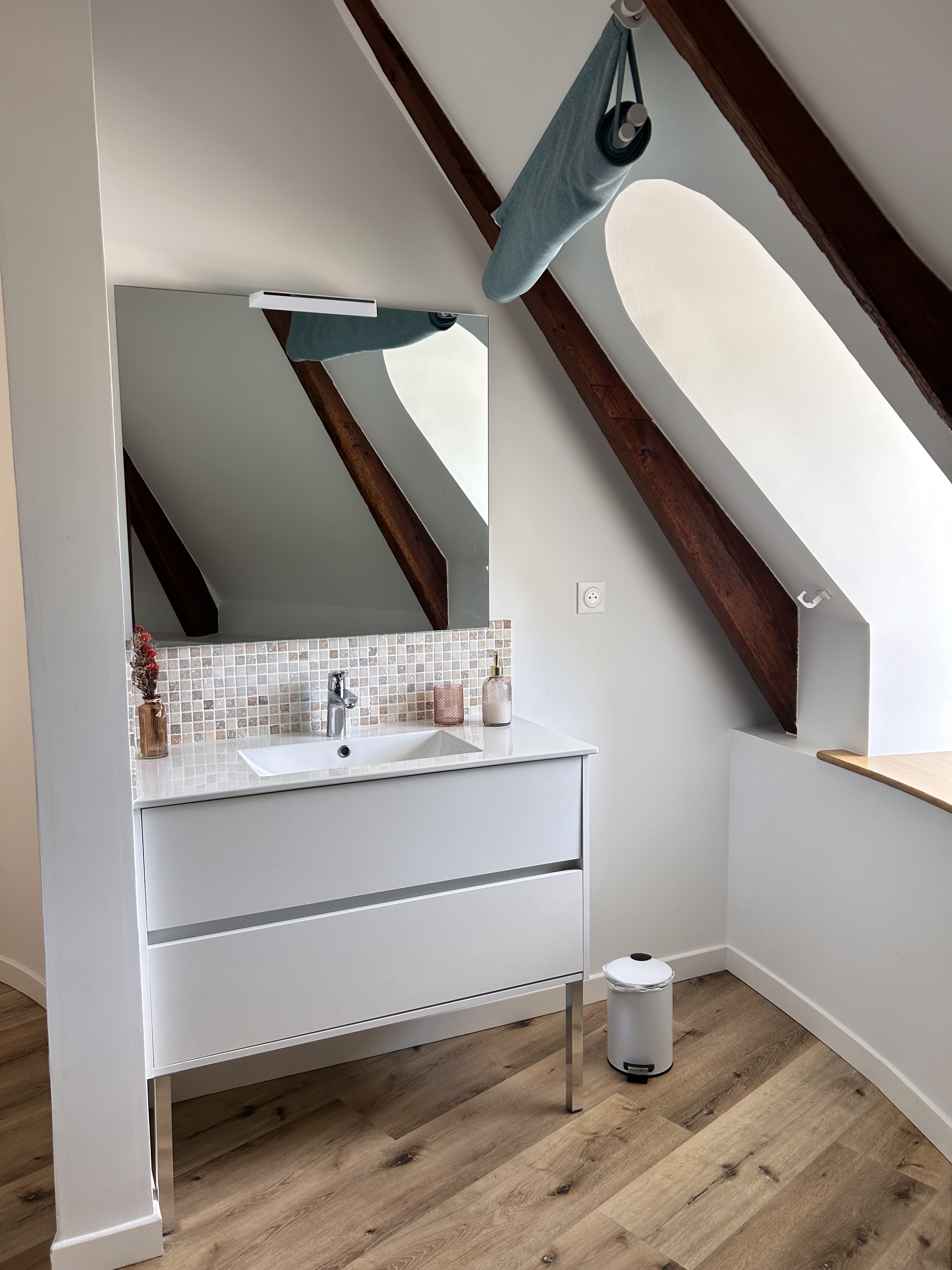 Grande maison de deux chambres avec salle de bain privative chacune au premier étage. Au second étage, chambre mansardée avec deux lits simples.