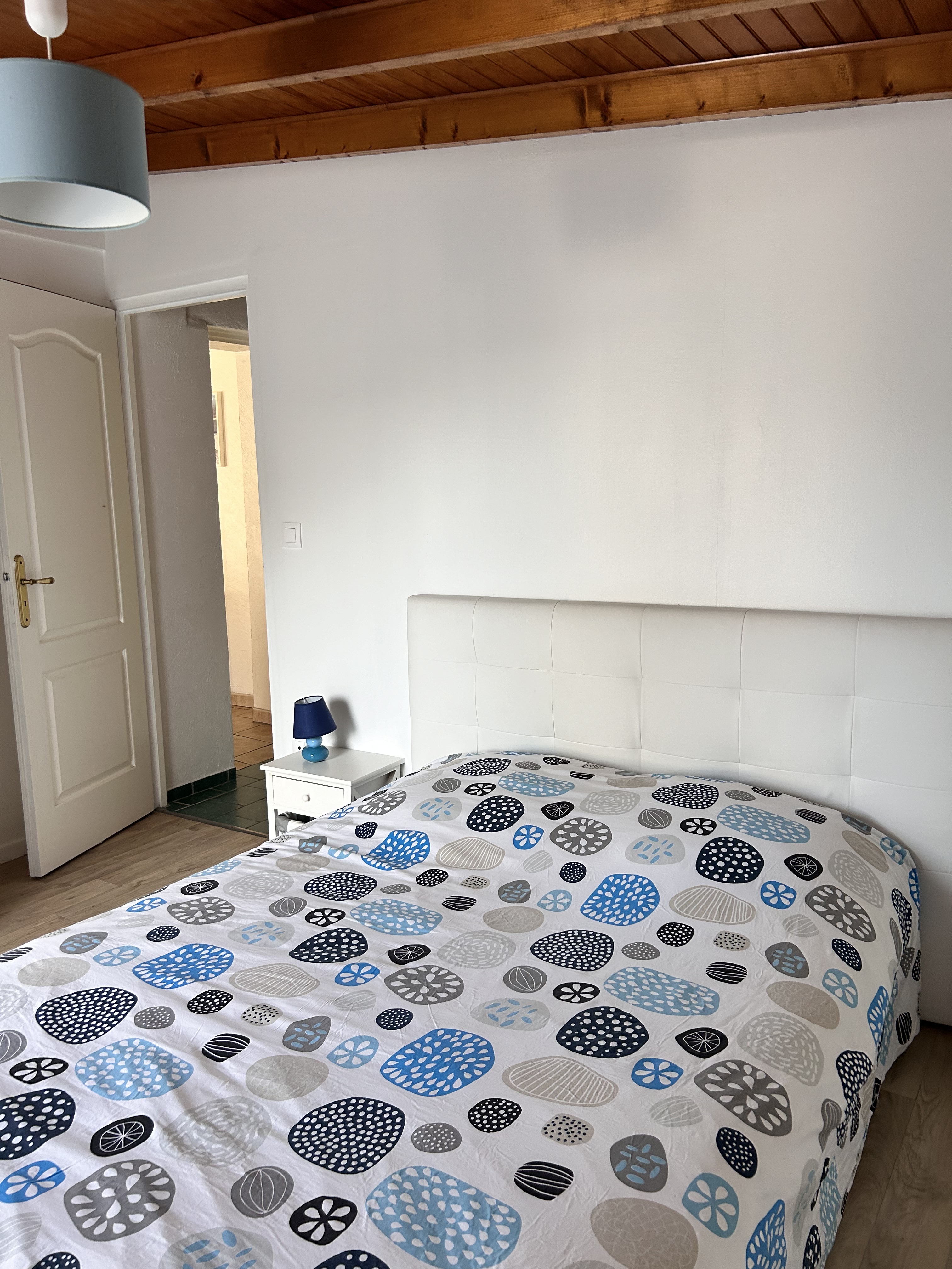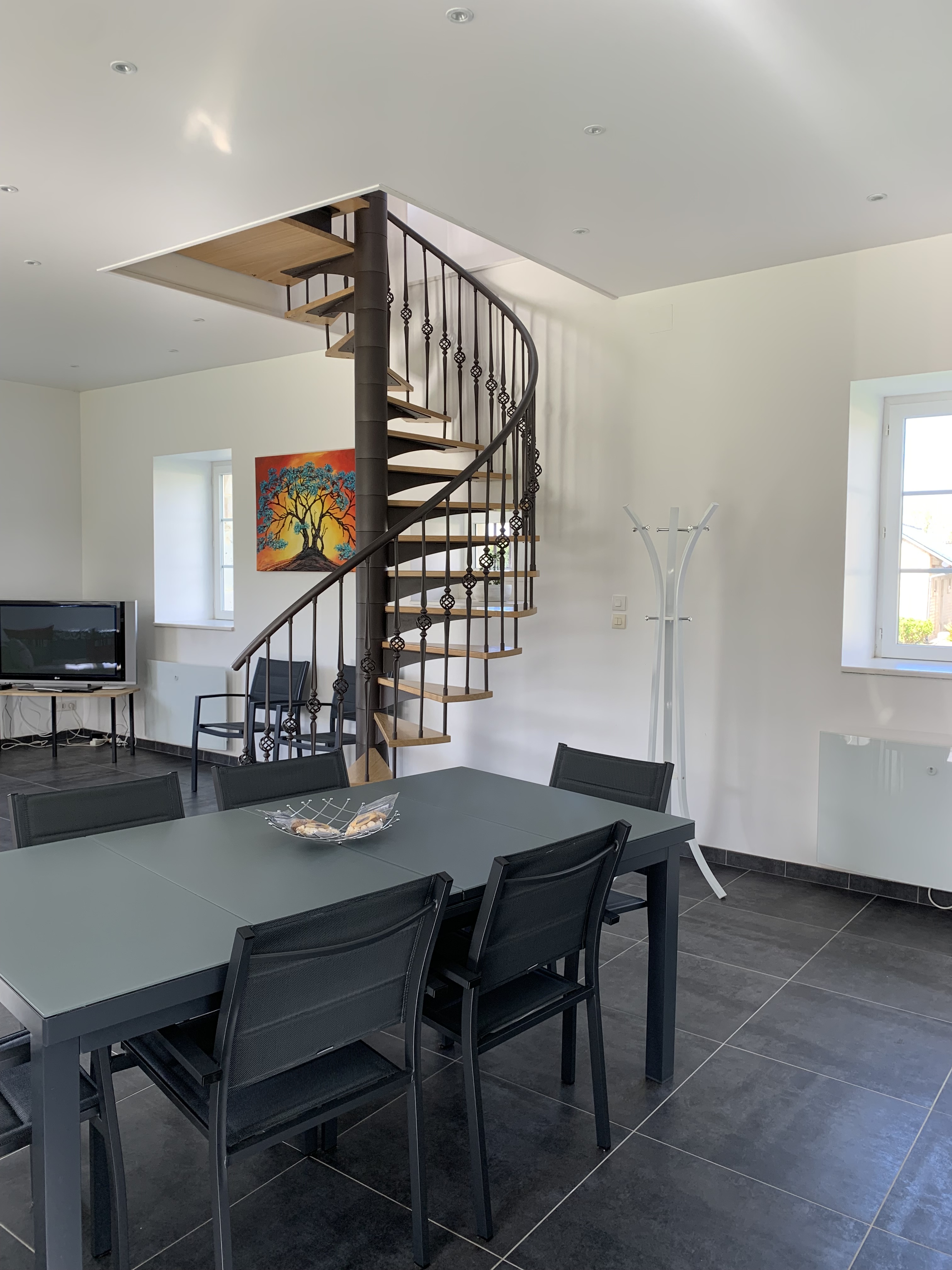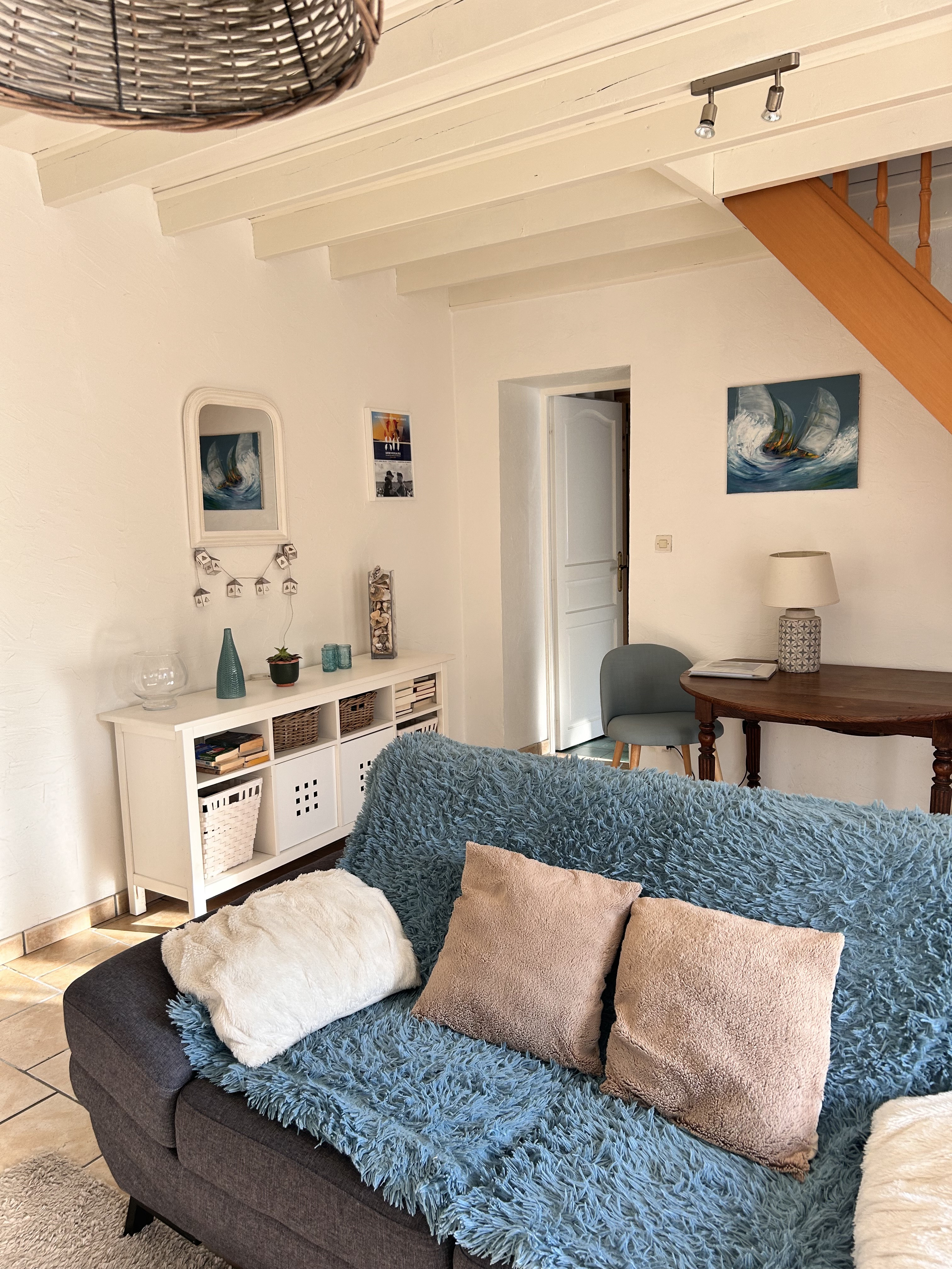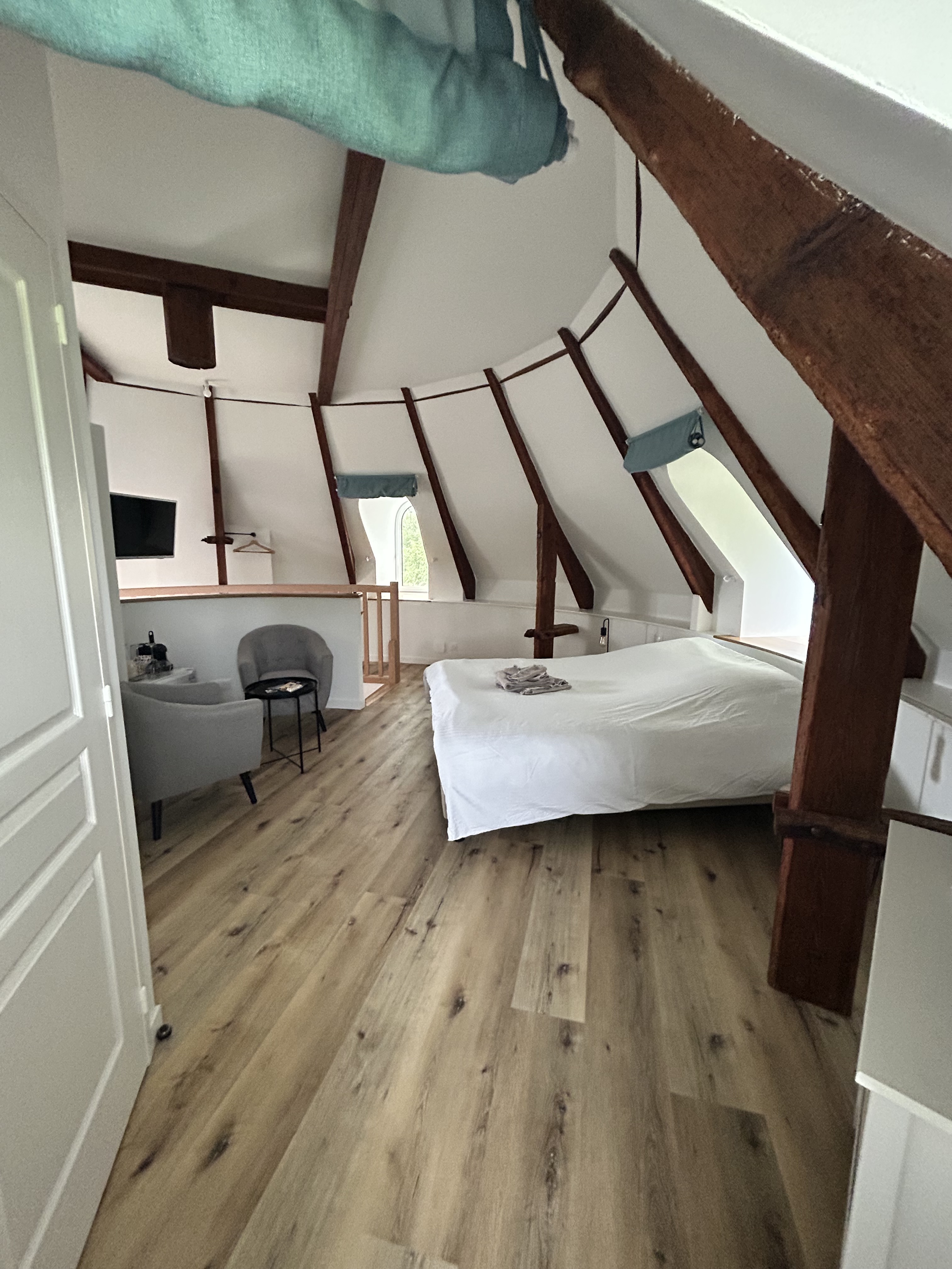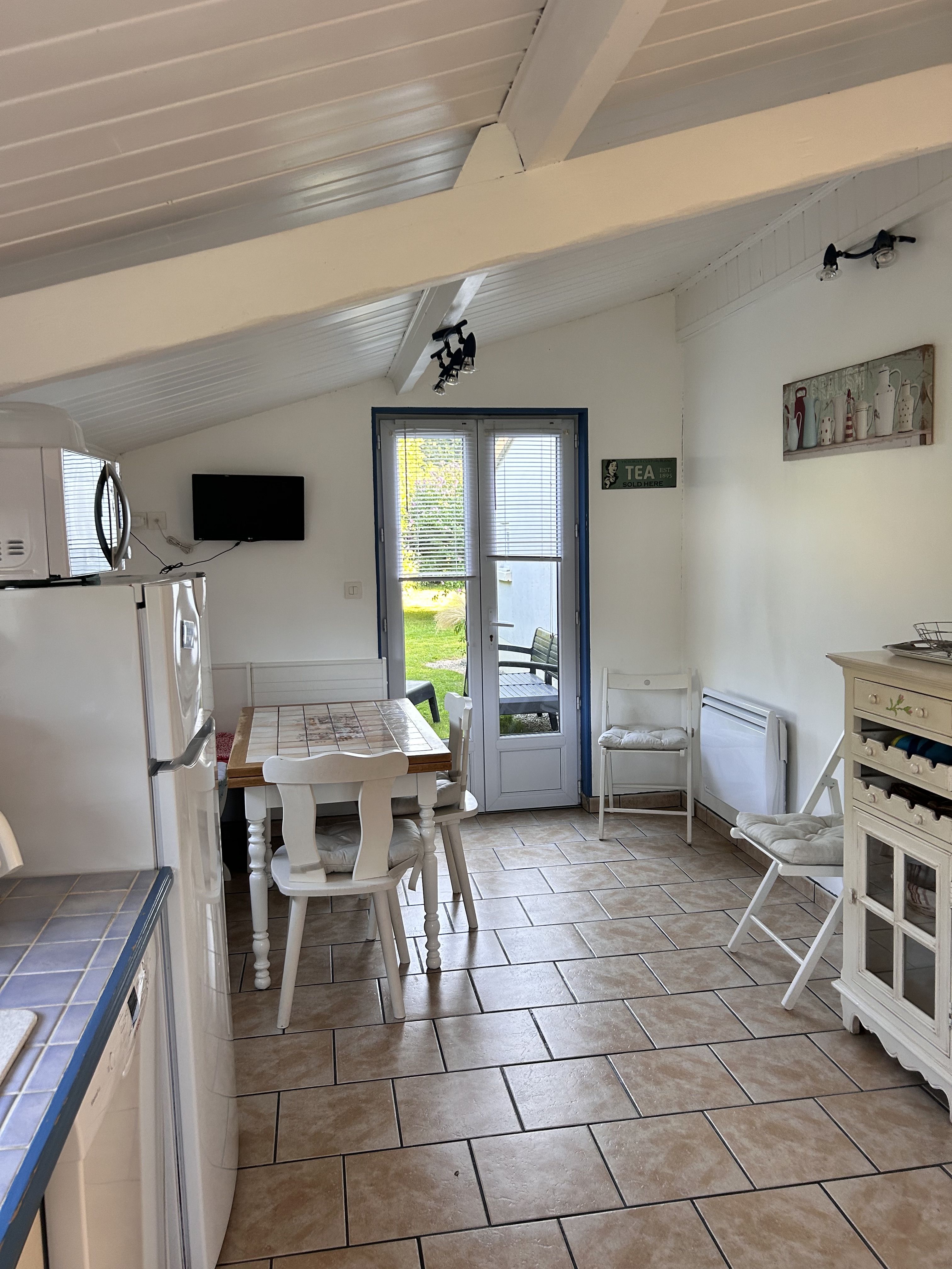 Grande maison de deux chambres avec salle de bain privative chacune au premier étage. Au second étage, chambre mansardée avec deux lits simples.