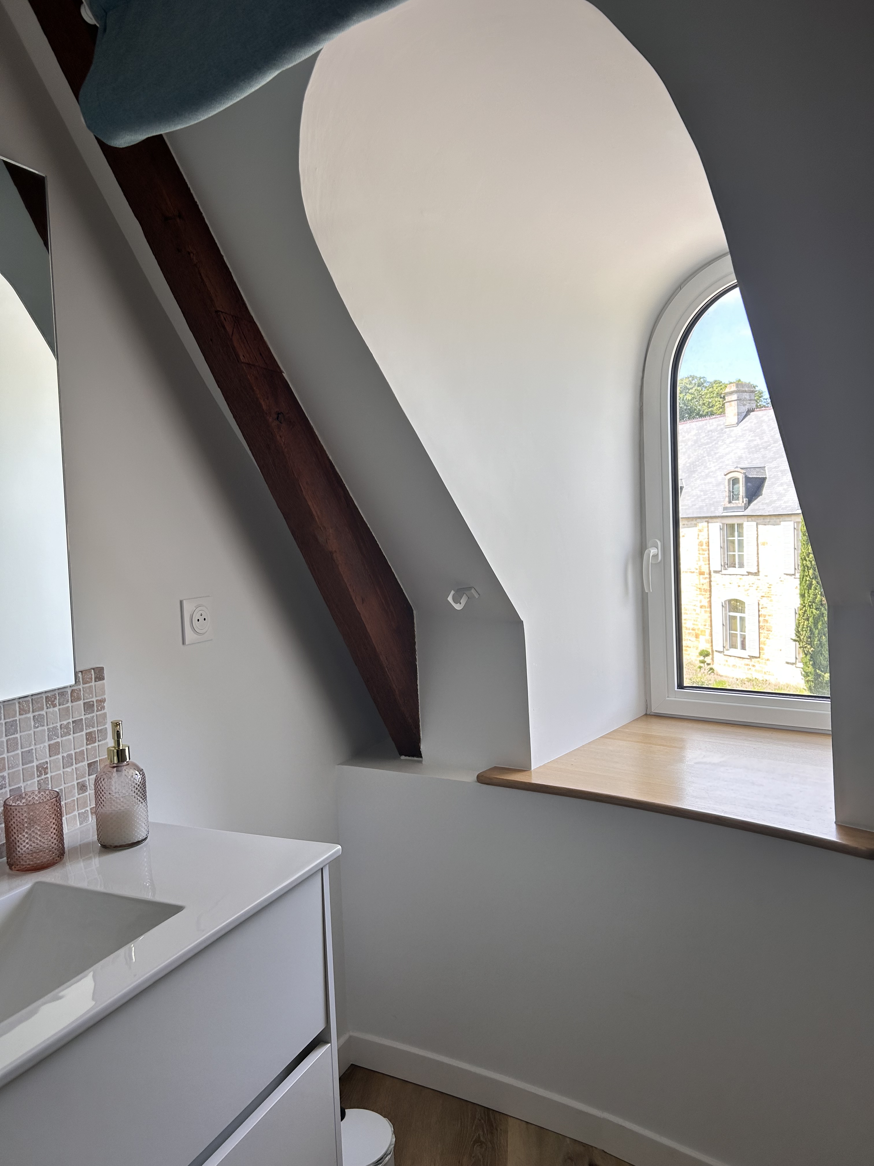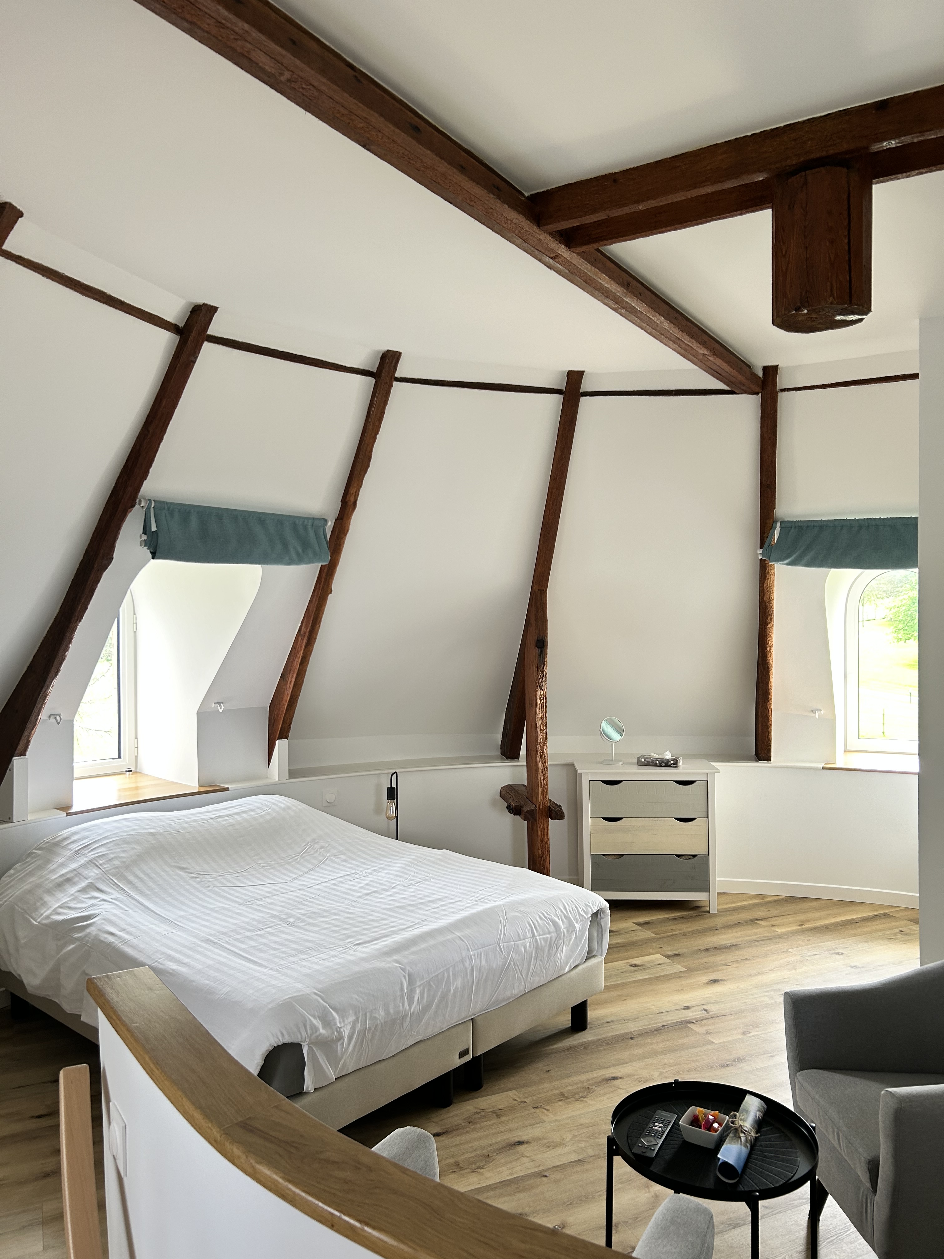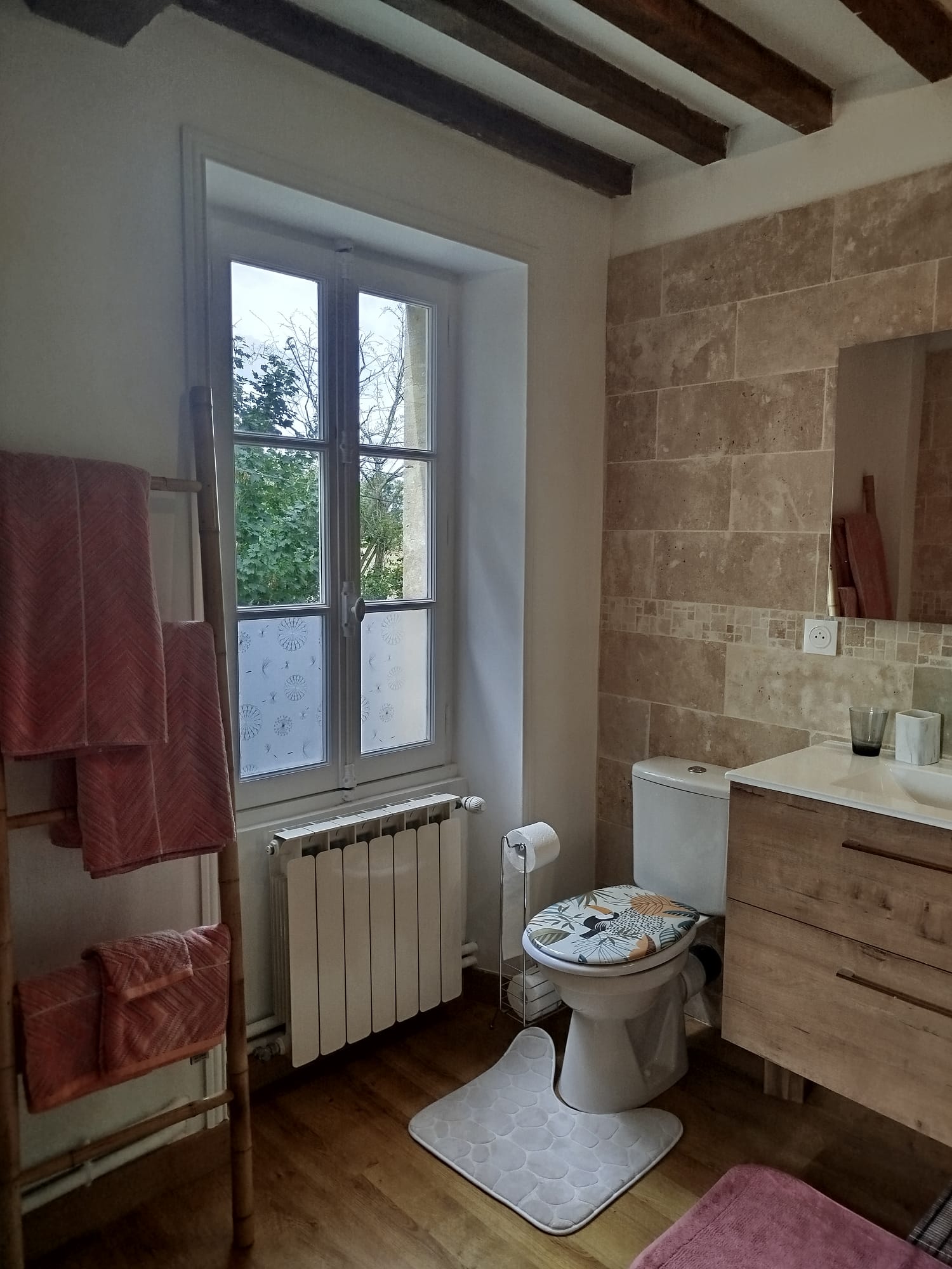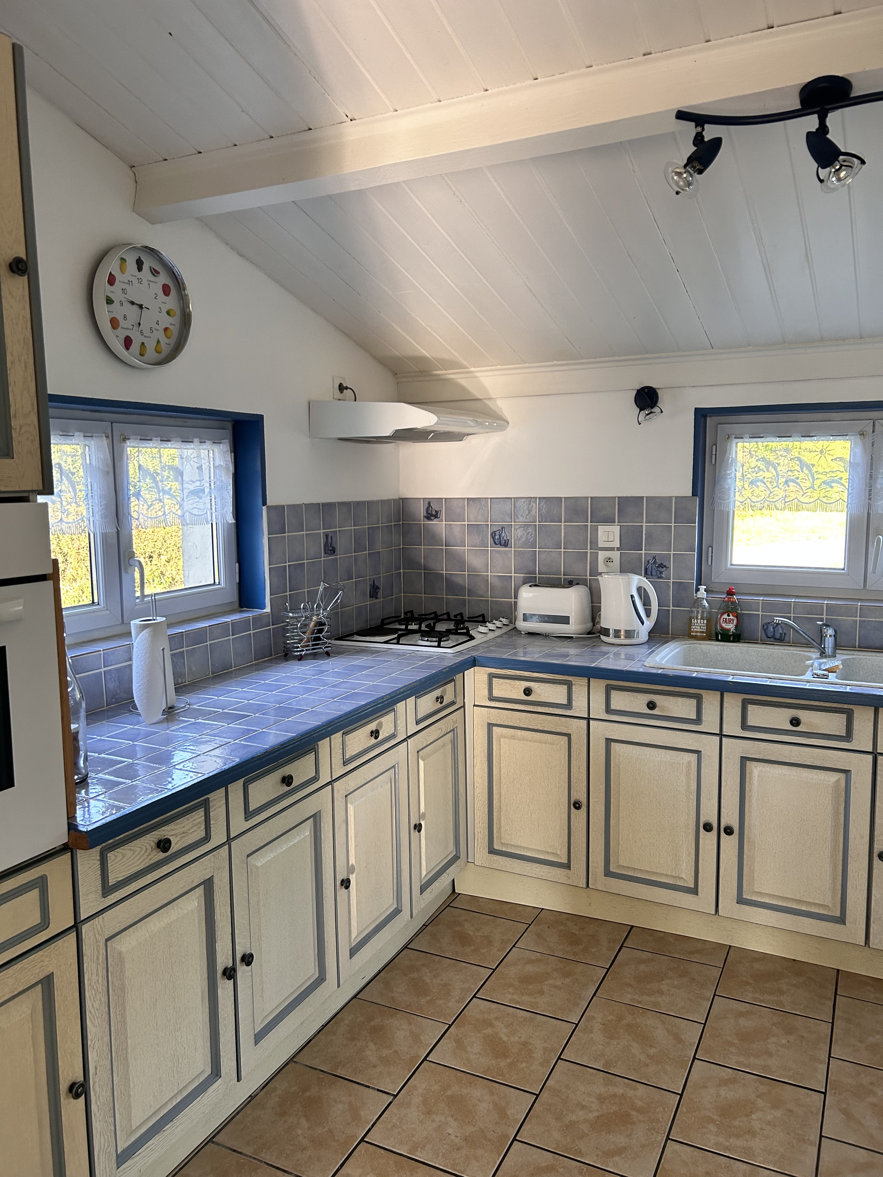 Grande maison de deux chambres avec salle de bain privative chacune au premier étage. Au second étage, chambre mansardée avec deux lits simples.